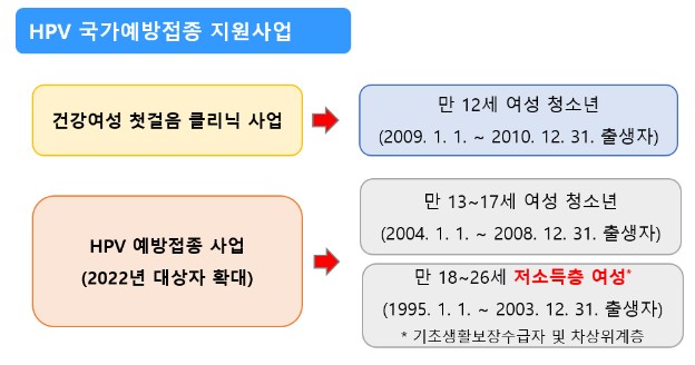 * 2022년 3월 14일부터 사람유두종바이러스 예방접종 대상자를 만 13~17세 여성 청소년, 만 18~26세 기초생활수급자 및 차상위 계층 여성으로 확대하여 HPV 예방접종 실시 예정