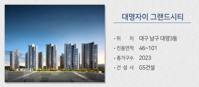 GS건설이 대구 남구 대명3동에 짓는 ‘대명자이 그랜드시티’를 분양합니다. 대구도시철도 2호선 반고개역, 3호선 남산역을 이용할 수 있으며 단지 앞에 초등학교가 있습니다. 두류공원, 앞산공원 등이 가까워 주거환경이 쾌적하며 홈플러스, 현대백화점 대구점, 상당시장 등의 상업시설도 이용하기 쉽습니다.
